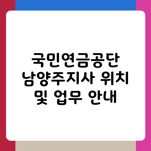 국민연금이라는 말만 들어도 머리가 복잡해지는 분들 많으시죠? 저도 그랬어요. 하지만 막상 필요한 정보를 찾으려니 생각보다 쉽지 않더라고요. 특히, 지역별 지사 위치나 업무 안내를 찾는 건 더욱 어려웠습니다. 그래서 오늘은 국민연금공단 남양주지사의 위치와 업무에 대해 자세히 알려드리려고 해요. 국민연금 관련 업무를 편리하게 해결하는데 도움이 될 거라고 생각합니다. 함께 알아볼까요?